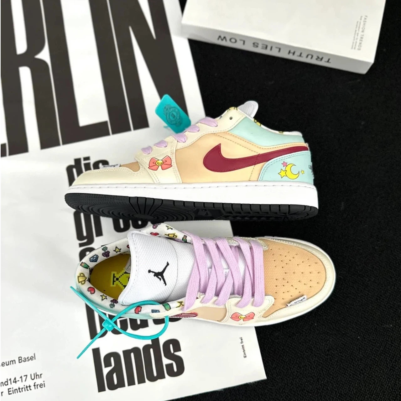 This Sailor Moon-inspired AJ1 features pastel hues, bow and moon-star details, and purple laces, blending anime charm with street style for a sweet, dreamy look.