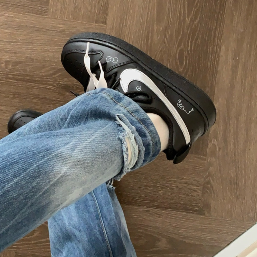 The "Black Kitty" Nike Court Borough remake features cute cat motifs and black-white contrasts, blending street style with feline charm for a playful, edgy look.